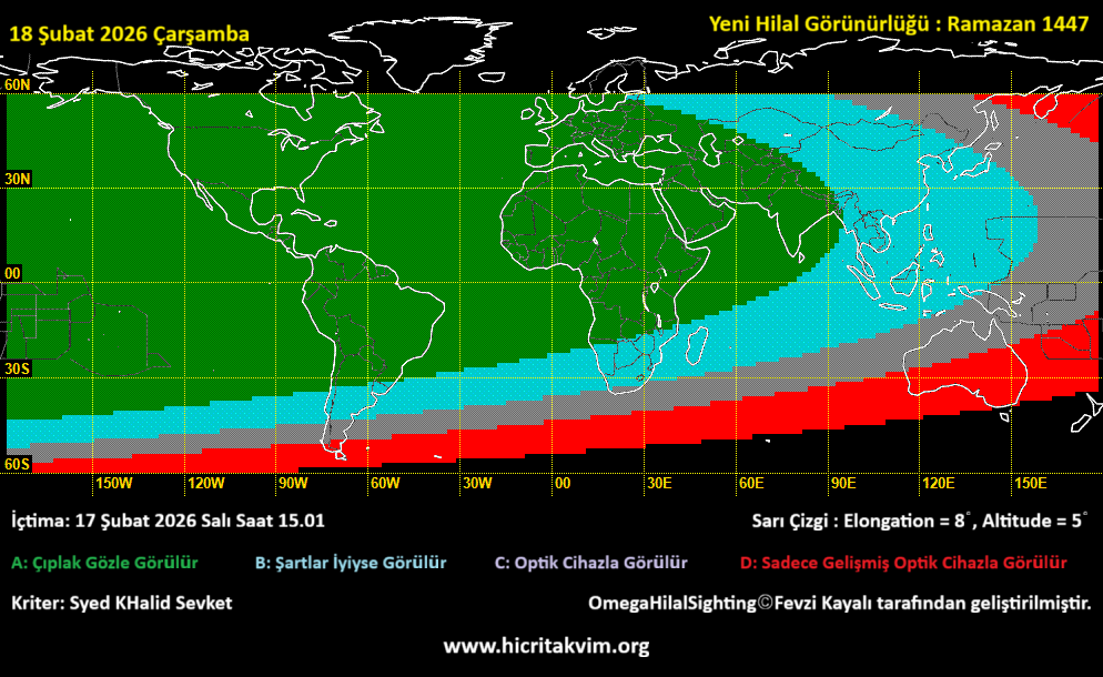 17 Şubat 2026 Salı günü saat 15:01´de İçtimâ ve 18 Şubat 2026 Çarşamba günü saat 05:00´de Ru'yet olacak ve hilal ilk defa Büyük Okyanus'tan itibaren görülmeye başlayacaktır.